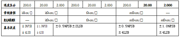 电 阻:10.0×10-6 ~ 200.0×10∧3 Ω, 分辨率1.0×10-6 ~ 0.1×10∧3 Ω (1.0×10-6 ~ 20.00×10∧3 Ω, 分辨率0.1×10-6 ~ 0.01×10∧3 Ω) 电 阻 率:10.0×10-6 ~ 200.0×10∧3 Ω-cm 分辨率1.0×10-6 ~ 0.1×10∧3 Ω-cm (1.0×10-6 ~ 20.00×10∧3 Ω-cm 分辨率0.1×10-6 ~ 0.01×10∧3 Ω-cm) 方块电阻:50.0×10-6 ~ 900.0×10∧3 Ω/□ 分辨率5.0×10-6 ~ 0.5×10∧3 Ω/□ (5.0×10-6 ~ 100.0×10∧3 Ω/□ 分辨率0.5×10-6 ~ 0.1×10∧3 Ω/□)